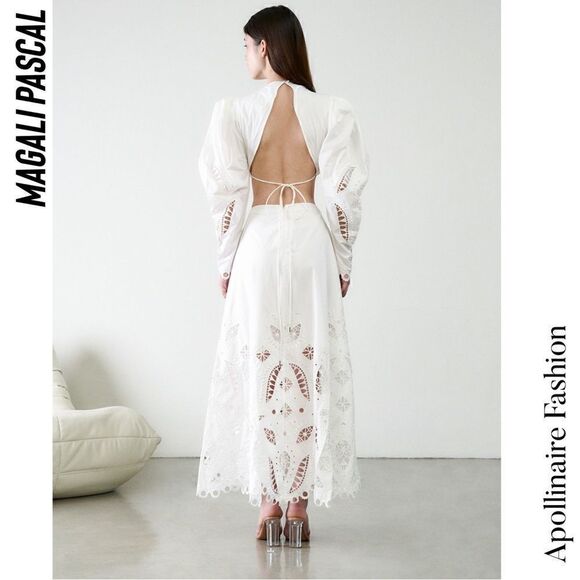 Magali Pascal's Percival maxi dress is crafted of crisp cotton poplin. This flowing piece is styled with exaggerated long puff sleeves, a cut-out bodice, and geometric lace down the skirt.