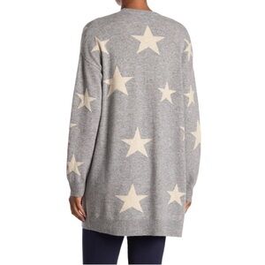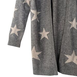 Magaschoni Star Long Open Front Cardigan. A warm and cozy lightweight knit sweater made from 100% cashmere. With a cream star design throughout the marked grey knit grey knit. Long sleeves, longline, duster length. Open front with no closure.