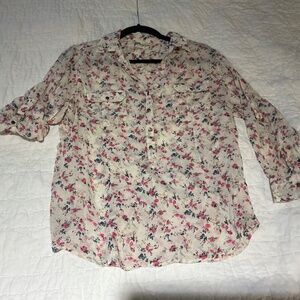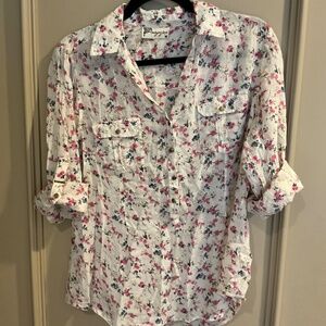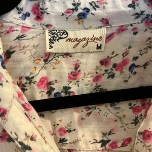 MAGAZINE lightweight 100% cotton, long sleeves can be converted to short sleeves with tabs, pink and blue floral blouse on off-white background with beautiful brass buttons and front pockets. Size Medium. Smoke free home.