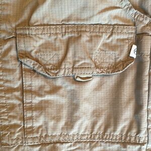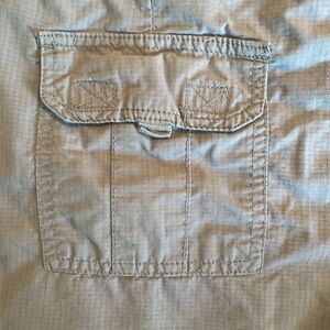 Comfortable tan cargo shorts. Multiple pockets. Durable fabric.
