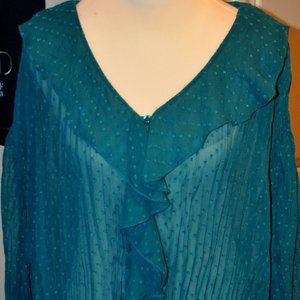 This blouse is new and tags fell off when we moved our store. Such a pretty sheer blouse to be worn with a camisole or tank. It can be very versatile and can be dressed up or down. The teal color is beautiful and is very true to size.