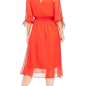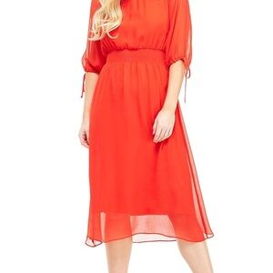 An elegant red midi dress with a flowy design, it features a cinched waist and three-quarter sleeves.