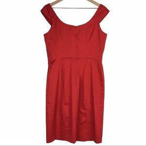 Dress is in good pre-owned condition. Fitted, slightly stretchy fabric. Classic red dress. Some discoloration along armpit seams. Dark spots on front near bottom hem. Small pull as well. See photos.