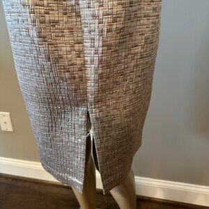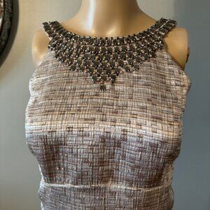 MAGGY LONDON GOLD METALLIC DRESSY SHIFT DRESS WITH JEWELED NECKLINE. BACK HAS TWO BUTTON NECK CLOSURE WITH KEYHOLE BACK TO ZIPPER.BACK SPLIT HEM NEEDS A LITTLE MENDING