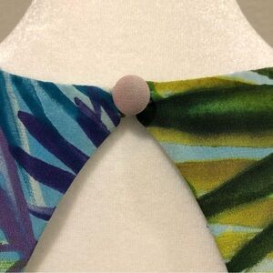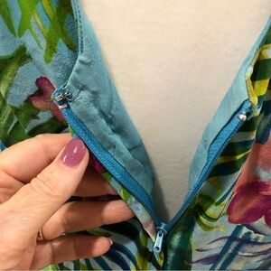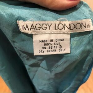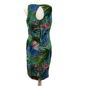 Maggy London 100% silk dress. Sleeveless. All over print of palm leaves and flowers. Fully lined. Back zipper. Key hole opening has button and loop closure. Size tag is missing. Very good pre-owned condition.