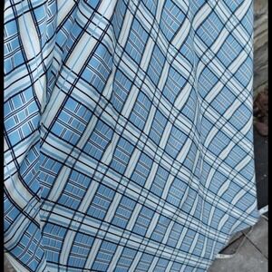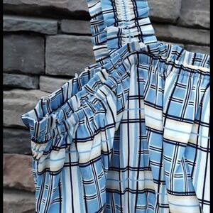 Soft blue /white. No pockets. Lined. Smocked in back of bodice. Side zip. Bust and waist about 32" (smocked part stretches). Length about 51". Weird part on smocking in back (see last photo).