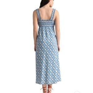 The Aurora gathered bodice sleeveless midi with square neckline, ruffle strap in blue and white windowpane print is the perfect elevated warm-weather dress you'll enjoy all season long.