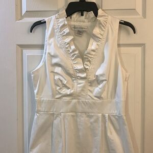 MAGGY LONDON DRESS WHITE W/BLACK PRINT ON SKIRT RUFFLE V NECK NWOT