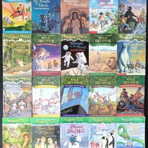HUGE SET OF 20 SCHOLASTIC MAGIC TREE HOUSE AND MERLIN MISSION BOOKS, very good condition from a smoke-free home. Some of the books look like they were never read; some are First Editions. Merlin Mission is for more advanced readers ages 7 thru 9. Stallion by Starlight has intact stickers. Book nos. listed as follows: #1-8, #11-13, #16-17, #20, #22. Merlin Mission books: #8, #31, #40, #42, #45. Important: No writing, names, or marks in any of these books.