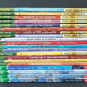 HUGE SET OF 20 SCHOLASTIC MAGIC TREE HOUSE AND MERLIN MISSION BOOKS, very good condition from a smoke-free home. Some of the books look like they were never read; some are First Editions. Merlin Mission is for more advanced readers ages 7 thru 9. Book nos. listed as follows: #1-8, #10-11, #14-16, #24-25, #27. Merlin Mission books #35, #36, #38, #39. Important: Book #11, #15, #24 has name inside front cover (see picture). These books are perfect if you want to start a Magic Tree House book collection.