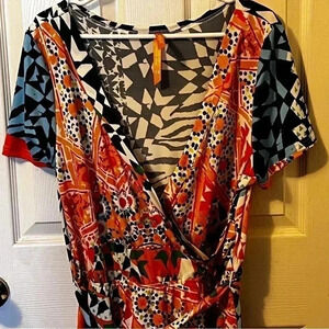 MAGIC abstract Print Maxi Low Cut V Neck Dress 1X EUC Summer Artsy Spring Long