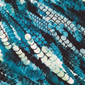 Aquarius Taylor tankini with sporty racer t-back. Handkerchief style front hemline elongates figure and hides curves. Multi blue green scale like pattern. New with tags.
