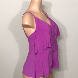Get wet and wild in the Magicsuit Solid Chloe Tankini Top with an enticing form of sexy layers that will easily catch everyone's eyes. Triple ruffle tiers help tame the tummy and shape the waist, leaving your curves concealed and your look effortless. Match with the High Waisted Brief. Bundle and save!