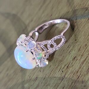 Absolutely GEORGEOUS genuine opals and diamond accenting, Set in 925 sterling silver with platinum plating to keep from tarnishing. New never worn. Size 8. (Can be sized.) The most beautiful opal Ever!!! The fire and colors in these stones are incredible! Simply magestic.