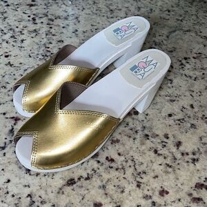 MAGUBA WOMEN'S STOCKHOLM SWEDEN WOOD HEEL CLOG Peep Toe Gold/White 39/9