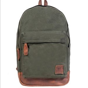Brown/green color canvas backpack in gently used condition. Leather straps torn from to- edge which can be repaired. Offers welcome