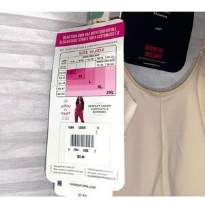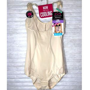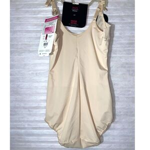 New with tags, Maidenform Flexees body shaper is designed to provide firm compression to the body, with a focus on the waist and hips. The shaper is made of a combination of nylon and spandex, and features an adjustable strap for a custom fit. It also has a "wear your own bra" cup size, allowing for added comfort and support. In addition, the shaper is lightweight and designed to be worn with a solid beige color, making it suitable for everyday wear. It is machine washable for easy care. This one-piece shaper is perfect for women who want to slim their waist and hips, while still feeling comfortable and supported.
