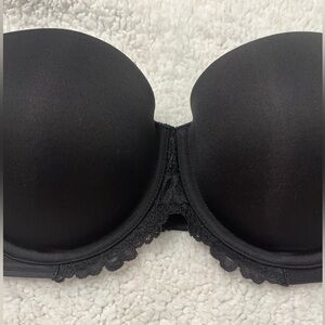 NWOT strapless bra as no straps are included. Lace panel at center gore extends along bottom of cups. Shiny microfiber underwire cups. Size 34D