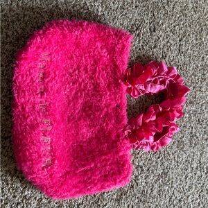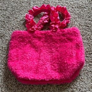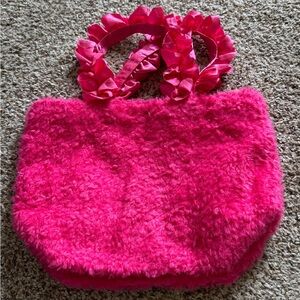 Bright pink fuzzy tote bag with ruffled handles. Perfect for adding a pop of color to any outfit.