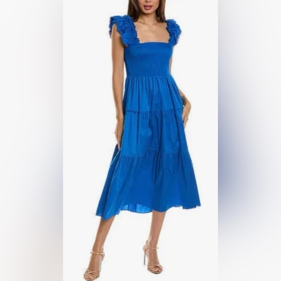 Introducing the Maison Maar Smocked Midi Dress, a stunning addition to your wardrobe. This dress features ruffled shoulder straps, a smocked bodice, and a tiered skirt for a feminine and flattering look. The cobalt color/pattern adds a pop of color to your ensemble.