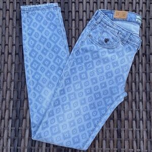 The La Parisienne Indigo Skinny Jeans by MAISON SCOTCH AMSTERDAMS BLAUW feature an ikat Diamond print in a light wash with intentional distressing.