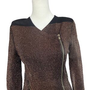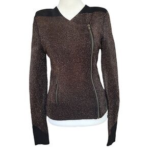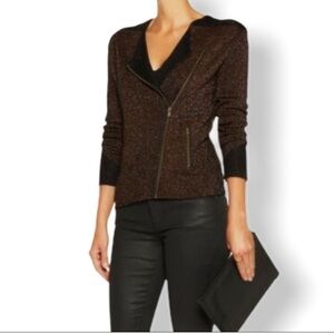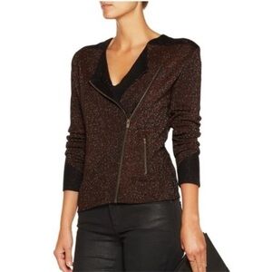 Maje Cardigan Perfecto. Shoulder pads, front zip, brown metallic, Front zip, fro. Zip pockets.