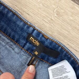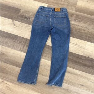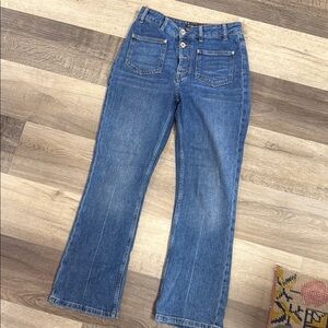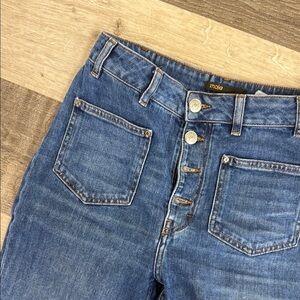 Mostly straight cut was just a slight flare at the ankle. Flattering button fly. Front pockets are a perfect detail for someone with straighter hips.