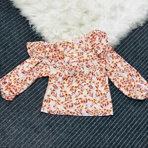 Styled to slip alluringly off one shoulder, this cotton blend top decked with ruffles and flower-powered is a charming start to lots of looks. One-shoulder neck. Long sleeves with elastic cuffs.