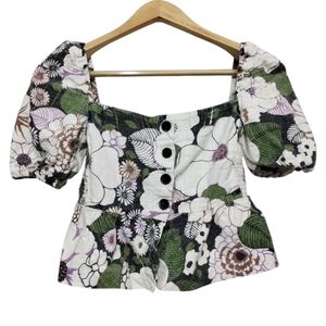 MAJE Loflower Cropped Organic Cotton Puff Sleeve Button Down Peplum Top Sz 1/S, vacation, cottage, resort, festival, cruise, beach, Hawaiian, tropical