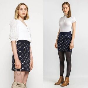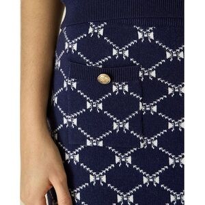 MAJE Navy Bow Design Jacquard Knit Gold Logo Button Patch Pocket Mini Skirt 6