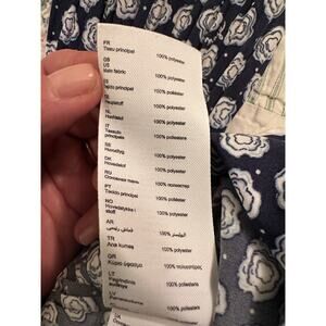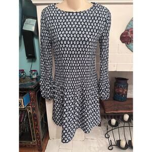 EXCELLENT CONDITION MAJE ROCKINOVER LONG SLEEVED DRESS IN NAVY AND WHITE PRINT. . SIZE IS 34 WHICH IS EQUIVALENT TO XS BUT PLEASE GO BY MEASUREMENTS IN PHOTOS. ORIGINALLY $295