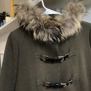 Beautiful olive/greyish green wool warm jacket/coat from French brand MAJE. Real raccoon fur trimmed hood in great condition. Two buckled closure and two pockets. For reference I am 5'10. This is a size EU 38/US 8 to accommodate for thicker sweaters in the winter. Only signs of wear is on either sleeves (inside-facing, towards the body) as showed in the picture but dry cleaning could fade it easily.