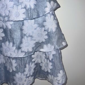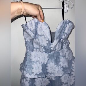 This stunning MAJORELLE dress features a sleeveless, sweetheart neckline and a flattering A-line silhouette. The silver hue and ruffled peplum detail make it perfect for wedding guests or cocktail events. Its elegant design ensures you stand out at any special occasion. It is missing the belt but I wore it without and it was still so cute!
