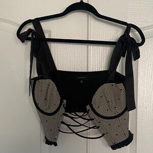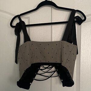 Chic crop top with lace-up front. Features plaid pattern and bow-tie straps.