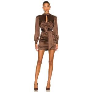 MAJORELLE Bristol Mini Dress Keyhole Neck Ruched Long Sleeve Chocolate Sz Small
