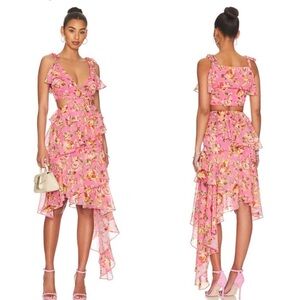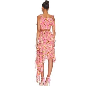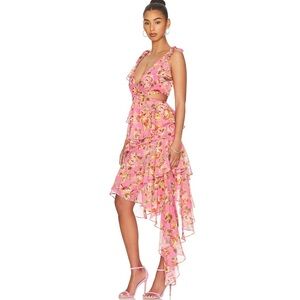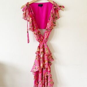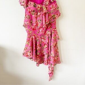 Elegant pink dress with floral design. Features layered ruffles and high low hem. Ideal for warm weather events.