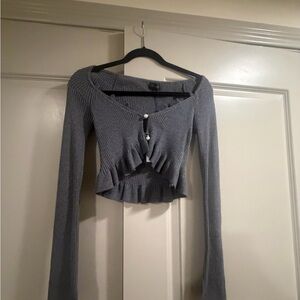 Soft ribbed knit with a deep scoop neckline. Decorative button front with pearl-like buttons. Subtle ruffle trim at hem and neckline. Fitted long sleeves and cropped silhouette. Stylish and versatile layering piece.