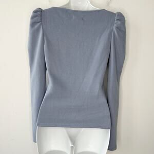 Long sleeved scoop neck (almost square neckline) top with puff sleeves in an adorable light blue color. The inside fabric is very soft and fuzzy.