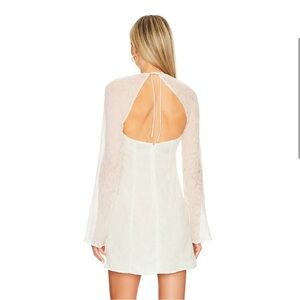 Elegant white mini dress by MAJORELLE. Features a halter neckline and sheer long sleeves. Perfect for a chic look.