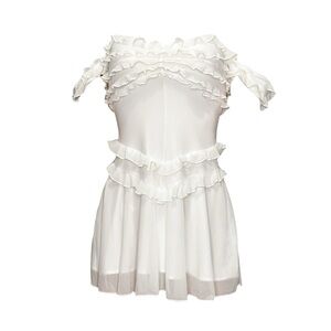 Elegant white mini dress. Features ruffle detailing. Off-shoulder design. Perfect for special occasions.
