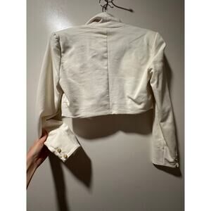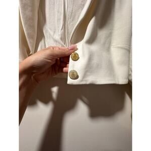 Majorelle cropped blazer in a classic white/cream color. Perfect for layering, this jacket features a stylish open-front design with a sophisticated shawl collar. The sleeves are adorned with beautiful gold-tone decorative buttons, adding a touch of elegance. This versatile piece can be dressed up for an evening out or paired with jeans for a smart casual look.
