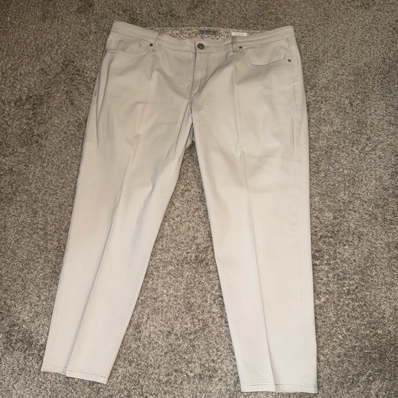 Chic light tan pants with a relaxed boyfriend fit. Features subtle floral lining. Ideal for casual wear.