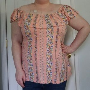 This is a peach top with a vertical floral design. It is a loose fit and is slightly off the shoulder but you can adjust the arms to be higher or lower on the shoulder. Only worn twice.
