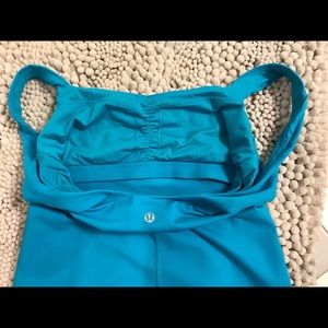 Reasonable Offers Accepted! Gorgeous Ocean Blue Lululemon Workout Tank in a size 8-10 ( size tag has been removed ) It has a built in shelf Bra as seen in photo. Cute ruching detail in the front as shown in photo. Only worn twice and in Excellent condition. Never put it the dryer. No rips, stains or tears. Like New