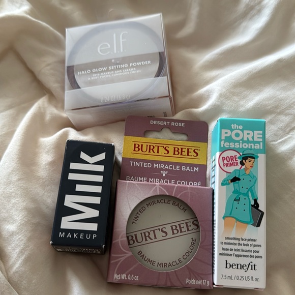 ELF HALO GLOW SETTING POWDER (LIGHT), MILK MAKEUP TOASTED SCULPT STICK (SWATCHED ONCE), BURTS BEES TINTED MIRACLE BALM (DESERT ROSE), THE PORE FESSIONAL FACE PRIMER (0.25 fl oz).