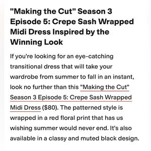 Elevate your style with this elegant black midi dress. Its sophisticated design and flattering fit make it perfect for any occasion! Sz: Women’s Sz S Color: Black Condition: New With Tags, no imperfections noted From the website: “The image displays the "Crepe Sash Wrapped Midi Dress Inspired by Jeanette's Winning Look" from Making the Cut Season 3 Episode 5. This dress is part of Jeanette Limas's collection, inspired by her winning "Festival Wear" runway look from that episode, which featured a satin cropped blouse and maxi skirt.” Questions? Leave a comment below! Check out my closet for similar sizes to bundle with and save on shipping! •Feel free to ask questions, make a reasonable offer,etc •Bundle to Save! I accept reasonable offers frequently. •Smoke free/Pet Free environment •New Items Listed Frequently •Shipped Same Day or Next Day NEW TO POSH?? Use the code BERTIBARGAINS when you sign up for $10 off your first purchase anywhere on Poshmark!🎉