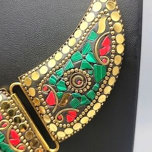 This stunning Tibetan jewelry set features a mosaic red coral and malachite design with vibrant gold plating. Features a floral design. Perfect for adding a touch of elegance to any outfit. 3 piece set includes 16-17" Necklace and earrings.