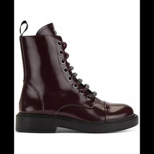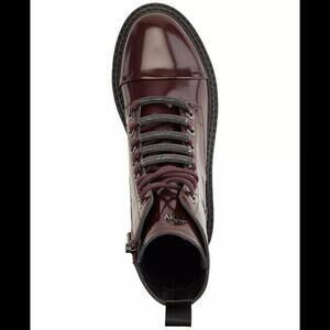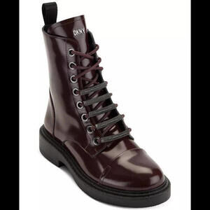 These combat boots are for women in size 8 US. They are made of brown faux leather with a lace-up closure and zipper. Suitable for casual, workwear, or business occasions in winter, fall, or spring. The brand is DKNY, and the boots have a medium calf width. Made in China.