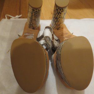 New, NO BOX OR BAG, MALENE BIRGER, Made in Portugal, white leather sandals with snakeskin covered platform, size 6. Genuine white leather straps with snakeskin covers on the plats. 6 inch heels, 2 inch platforms, wide round heels, very easy to walk in. 1026575