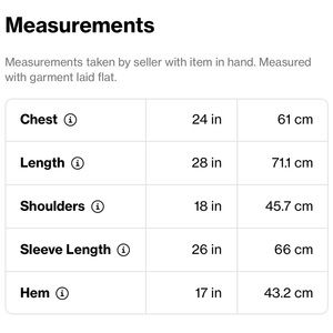 Measurements: shoulder 18 in chest 24 in sleeve 26 in hem 17in length 28 in